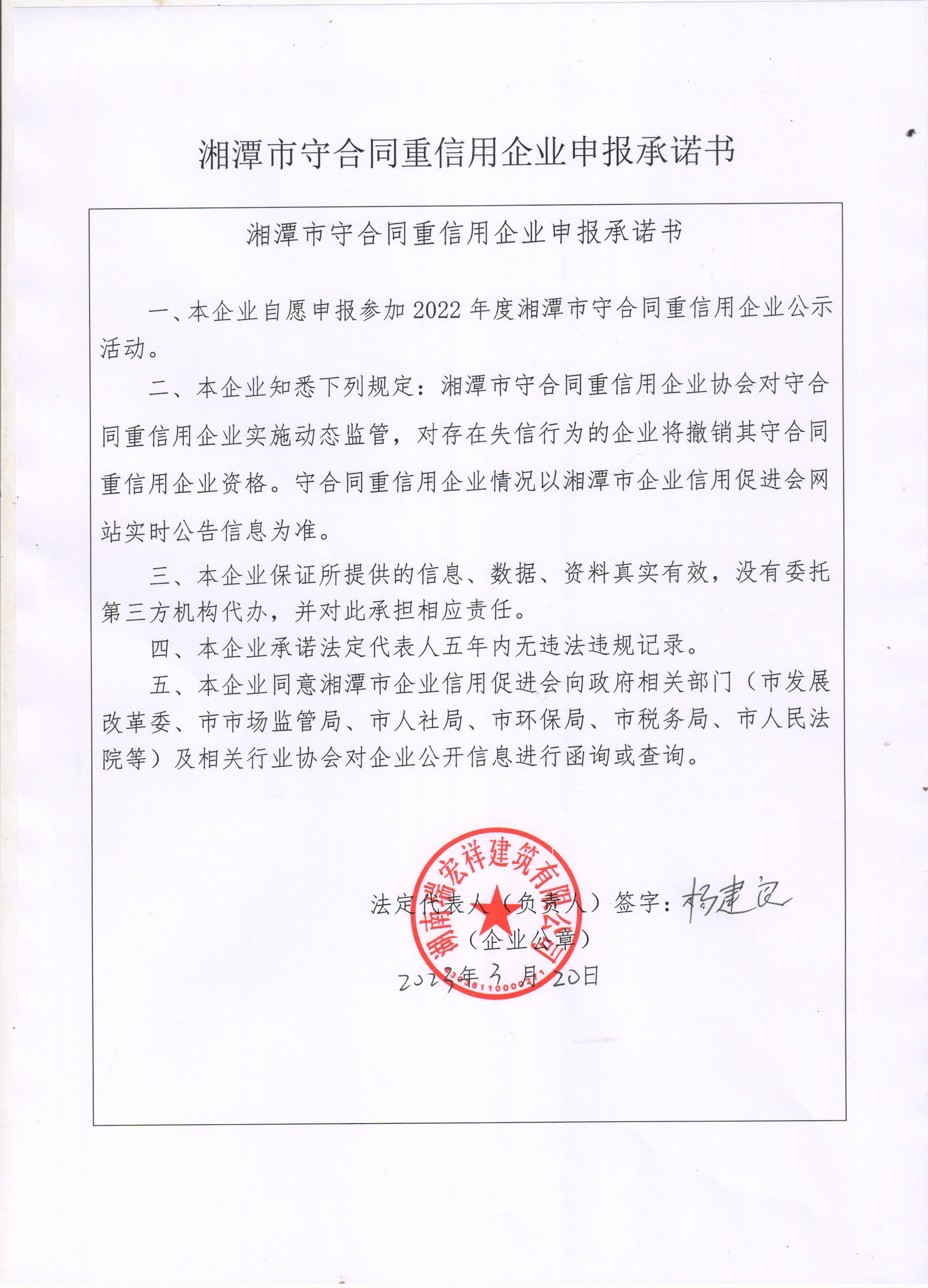 本企業(yè)根據(jù)《湘潭市守合同重信用企業(yè)申報(bào)規(guī)定》等編制 2022 年度企業(yè)信用報(bào)告書,并保證本報(bào)告書內(nèi)容真實(shí)、準(zhǔn)確、完整。