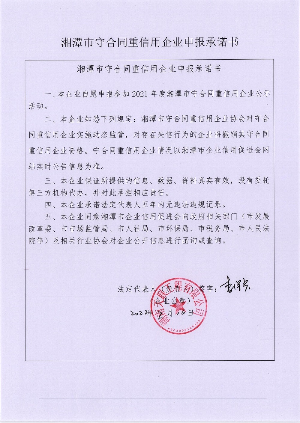 本企業(yè)根據(jù)《湘潭市守合同重信用企業(yè)申報(bào)規(guī)定》等編制 2021 年度企業(yè)信用報(bào)告書,并保證本報(bào)告書內(nèi)容真實(shí)、準(zhǔn)確、完整。