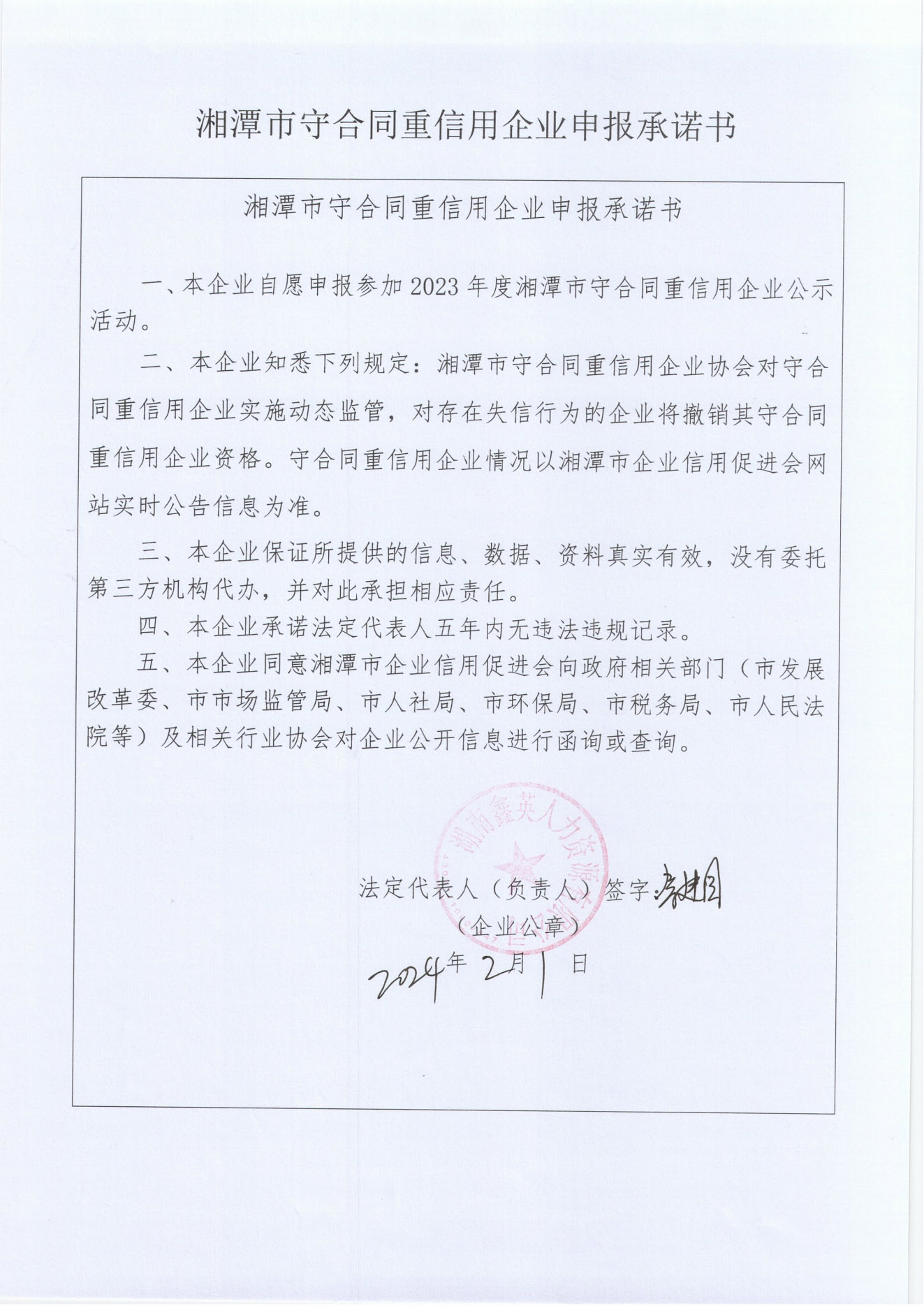 本企業(yè)根據(jù)《湘潭市守合同重信用企業(yè)申報規(guī)定》等編制 2023 年度企業(yè)信用報告書,并保證本報告書內(nèi)容真實(shí)、準(zhǔn)確、完整。