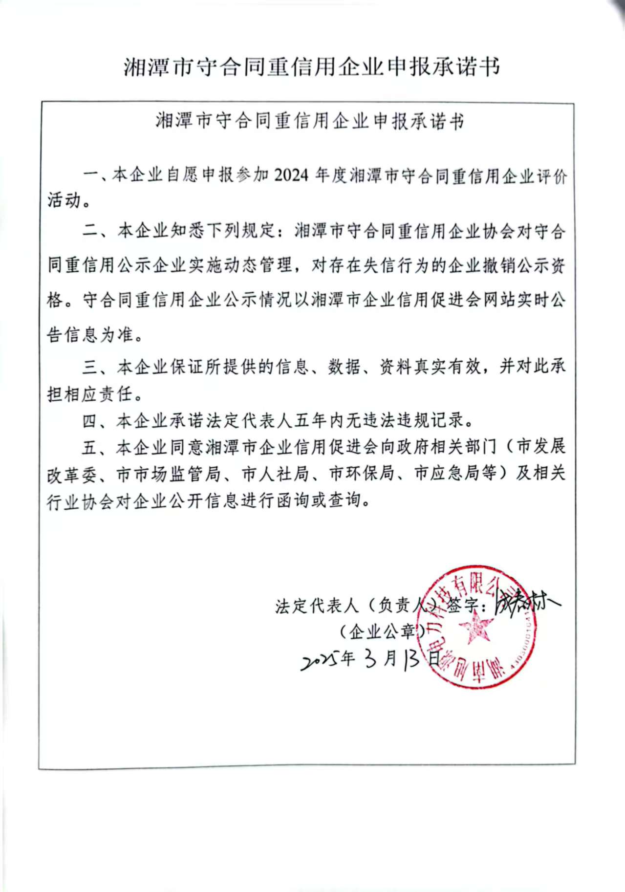 本企業(yè)根據(jù)《湘潭市守合同重信用企業(yè)申報(bào)規(guī)定》等編制 2024 年度企業(yè)信用報(bào)告書,并保證本報(bào)告書內(nèi)容真實(shí)、準(zhǔn)確、完整。