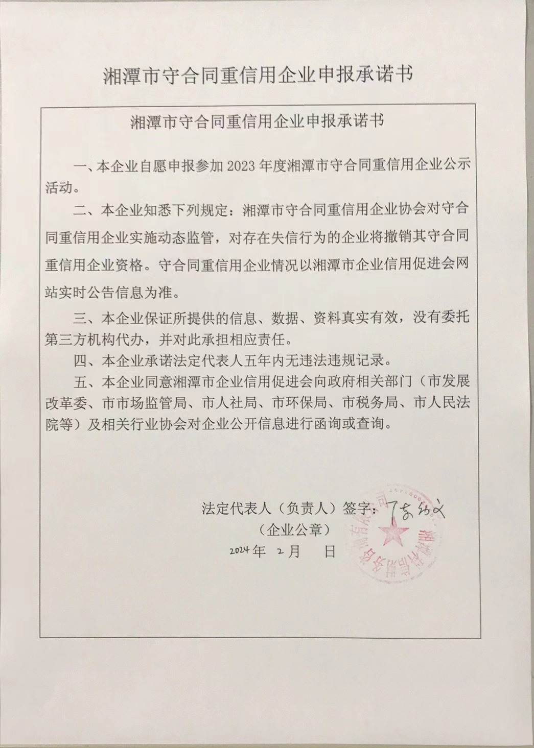 本企業(yè)根據(jù)《湘潭市守合同重信用企業(yè)申報規(guī)定》等編制 2023 年度企業(yè)信用報告書,并保證本報告書內(nèi)容真實、準(zhǔn)確、完整。