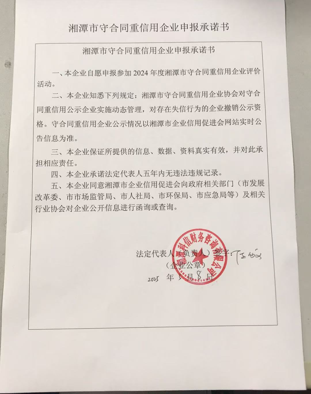 本企業(yè)根據(jù)《湘潭市守合同重信用企業(yè)申報規(guī)定》等編制 2024 年度企業(yè)信用報告書,并保證本報告書內(nèi)容真實、準確、完整。