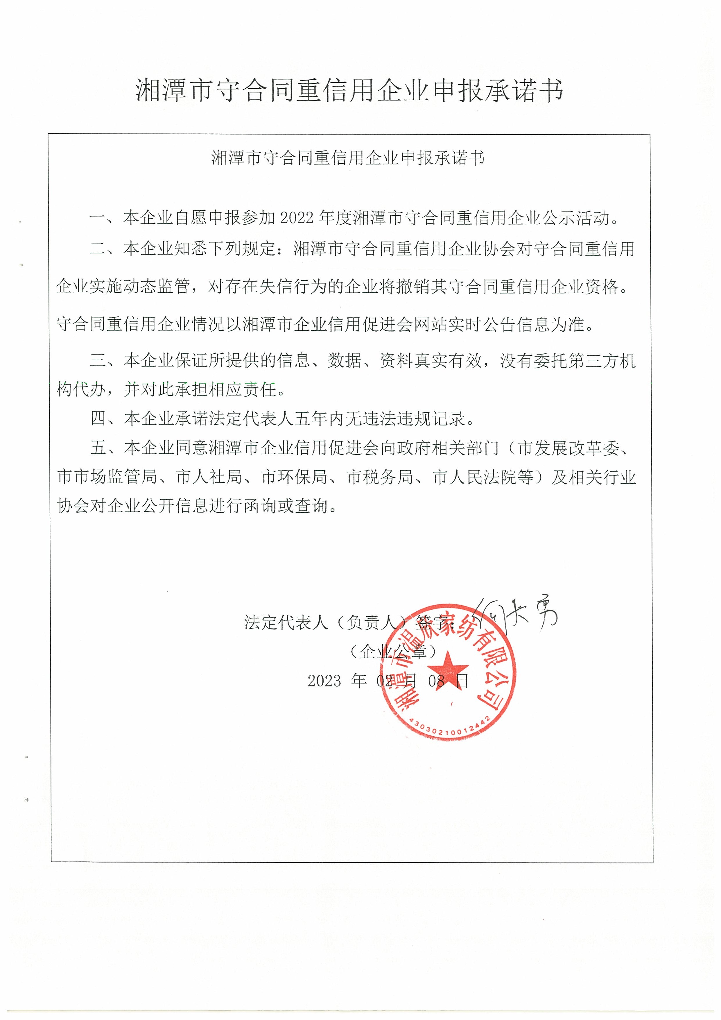 本企業(yè)根據(jù)《湘潭市守合同重信用企業(yè)申報(bào)規(guī)定》等編制 2022 年度企業(yè)信用報(bào)告書,并保證本報(bào)告書內(nèi)容真實(shí)、準(zhǔn)確、完整。