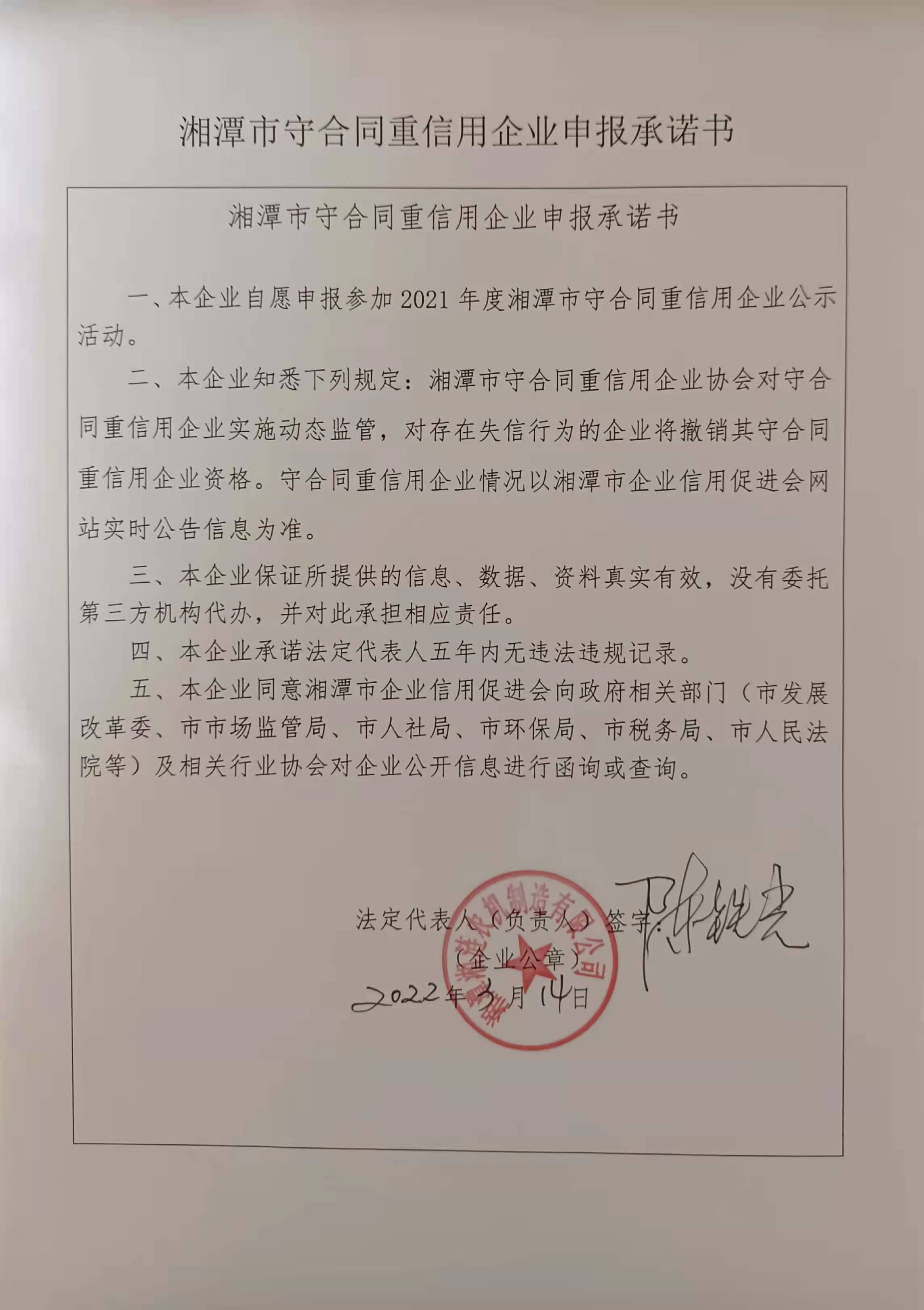 本企業(yè)根據(jù)《湘潭市守合同重信用企業(yè)申報(bào)規(guī)定》等編制 2021 年度企業(yè)信用報(bào)告書,并保證本報(bào)告書內(nèi)容真實(shí)、準(zhǔn)確、完整。